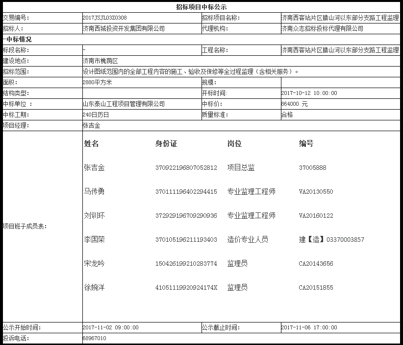 濟南西客站片區臘山河以東部分支路工程監理中標公示