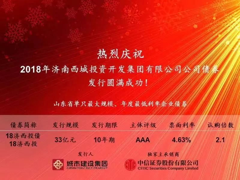 12月14日,濟南城市建設集團全資子公司濟南西城投資開發(fā)集團有限公司成功發(fā)行33億元企業(yè)債券,共有53家機構參與認購,認購倍數2.1倍,認購總額達到70億元,發(fā)行利率4.63%,期限10年。該筆企業(yè)債券創(chuàng)下多項省市企業(yè)債券發(fā)行之最,是我省2018年規(guī)模最大、本年度利率最低的企業(yè)債券,同時該筆債券融資也是濟南市有史以來獲批最大規(guī)模、今年唯一一筆企業(yè)債券。