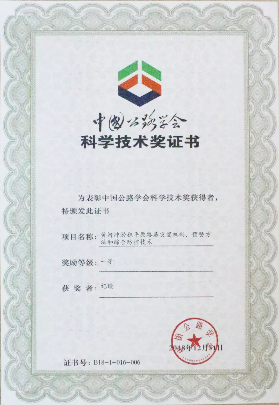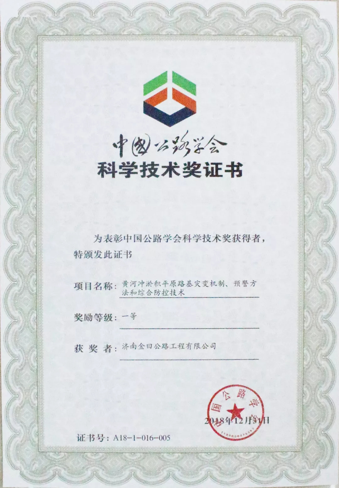 2019年6月15日,由中國公路學(xué)會組織的“2018年度中國公路學(xué)會科學(xué)技術(shù)獎頒獎大會”在北京國家會議中心召開。濟(jì)南金曰公路工程有限公司參與研究的課題《黃河沖淤積平原路基災(zāi)變機(jī)制、預(yù)警方法和綜合防控技術(shù)》榮獲一等獎。