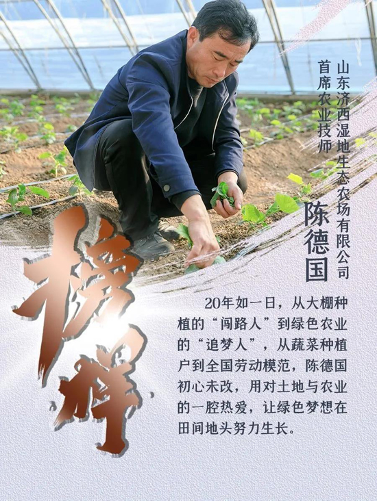 作為黃河流域濟南段的“綠色明珠”,濟西濕地四季分明、五彩斑斕。濟南城市建設集團所屬山東濟西濕地生態農場有限公司連片的蔬菜大棚里,首席農業技師陳德國早出晚歸、“兩頭不見太陽”,無暇欣賞這近在遲尺的變幻景色,但他卻看得見春耕夏種、秋收冬藏,在深耕細作中收獲豐收的喜悅。20年如一日,從大棚種植的“闖路人”到綠色農業的“追夢人”,從蔬菜種植戶到全國勞動模范,陳德國初心未改,用對土地與農業的一腔熱愛,讓綠色夢想在田間地頭努力生長。