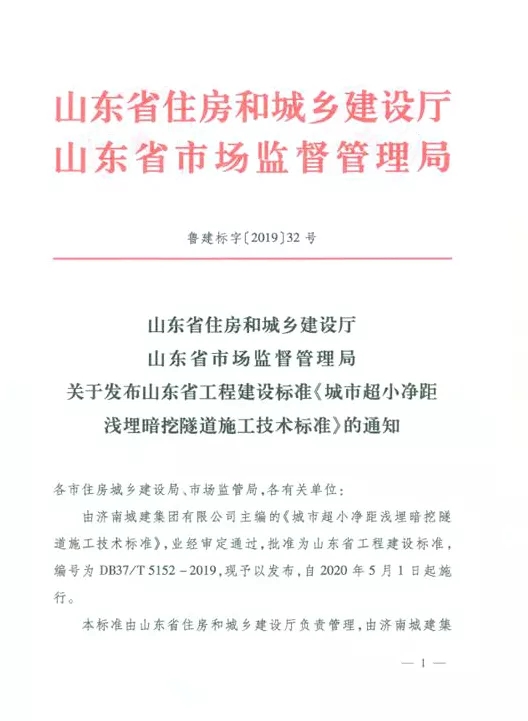 近日,山東省住房和城鄉(xiāng)建設(shè)廳與山東省市場監(jiān)督管理局聯(lián)合下發(fā)魯建標(biāo)字[2019]32號文《關(guān)于發(fā)布山東省工程建設(shè)標(biāo)準(zhǔn)〈城市超小凈距淺埋暗挖隧道施工技術(shù)標(biāo)準(zhǔn)〉的通知》,宣布由城建集團(tuán)主編的該標(biāo)準(zhǔn)業(yè)經(jīng)審定通過,批準(zhǔn)為山東省工程建設(shè)標(biāo)準(zhǔn),編號為DB37/T 5152-2019,予以發(fā)布,自2020年5月1日起施行。這是城建集團(tuán)主編并已發(fā)布的第九部山東省工程建設(shè)標(biāo)準(zhǔn),對省內(nèi)隧道施工起到了一定的規(guī)范指導(dǎo)作用。
