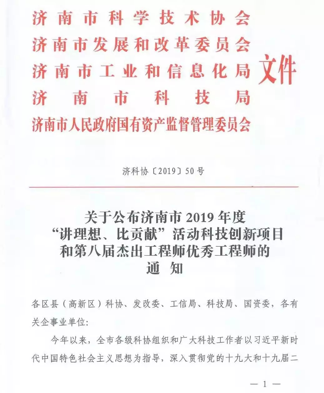 為了更好激勵科技工作者胸懷自主創新夢想,把實現自身價值同企業發展和實現中國夢緊密結合起來,倡導和樹立社會主義核心價值觀,弘揚創新精神和創新文化,日前,根據《濟南市“講理想、比貢獻”活動實施辦法》,濟南市發改委、經信委、科技局、國資委、科協聯合組織開展了“講理想、比貢獻,奮力實現中國夢”活動。經過各級科協組織推薦、專家評審、社會公示和市“講理想、比貢獻”活動領導小組審定,濟南金衢公路勘察設計研究有限公司《協同設計及路網數據庫管理系統》獲得濟南市2019年度科技創新項目獎。