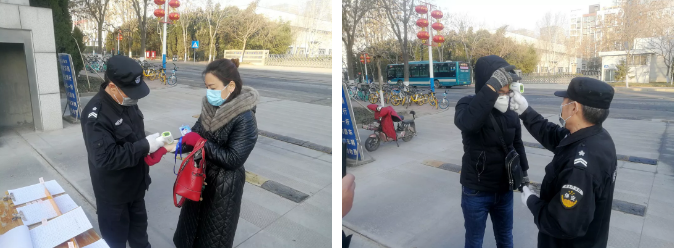 金宇公司物業(yè)分公司通過在門口設置體溫測量點,嚴格落實小區(qū)入口登記和體溫監(jiān)測制度。安保人員在門口24小時值守,進入園區(qū)需持疫情期間臨時通行證,嚴格執(zhí)行“三不準”:不戴口罩者一律不準進入辦公區(qū);不接受體溫量測者一律不準進入辦公區(qū);測量體溫高于37.3℃(含)者一律不準進入辦公區(qū)。