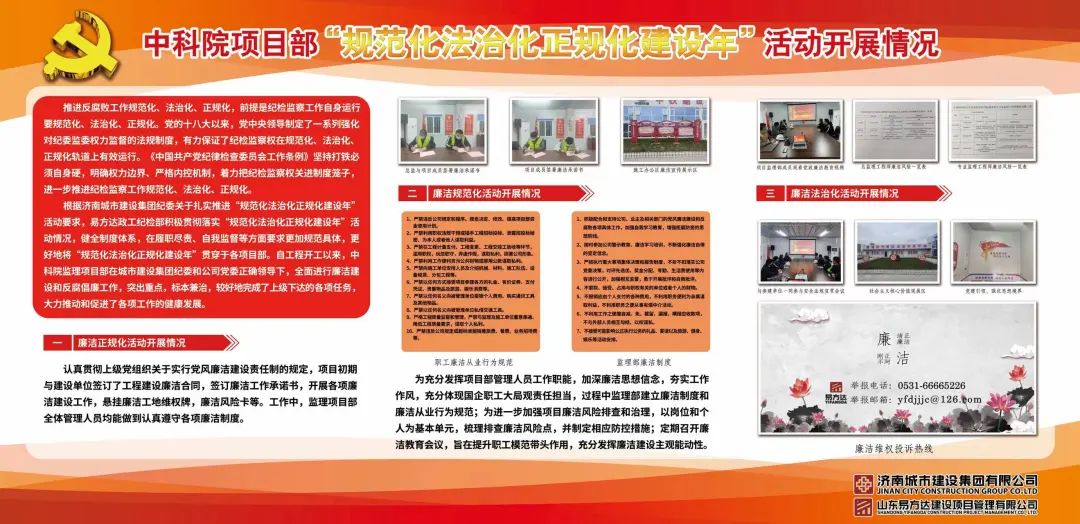 調(diào)研組一行先后到濟鋼森林公園地下商業(yè)項目、中國科學院空天信息創(chuàng)新研究院濟南園區(qū)(一期)建設項目現(xiàn)場察看,詳細了解了項目疫情防控、規(guī)范化法治化正規(guī)化建設、安全生產(chǎn)、項目建設推進等管理情況。通過調(diào)研,對兩個項目在疫情防控、推動廉潔文化及規(guī)范化法治化正規(guī)化建設方面取得的工作成效給予高度肯定。易方達公司在業(yè)務開展的各個環(huán)節(jié)中,能夠持續(xù)推進重點項目規(guī)范化法治化正規(guī)化建設,積極落實項目部黨風廉政建設責任制,全面簽訂廉政工作承諾書,建立健全反腐倡廉制度及職工“廉潔從業(yè)行為十條規(guī)范”,全面排查廉政風險,做到自上而下保持廉潔風氣。