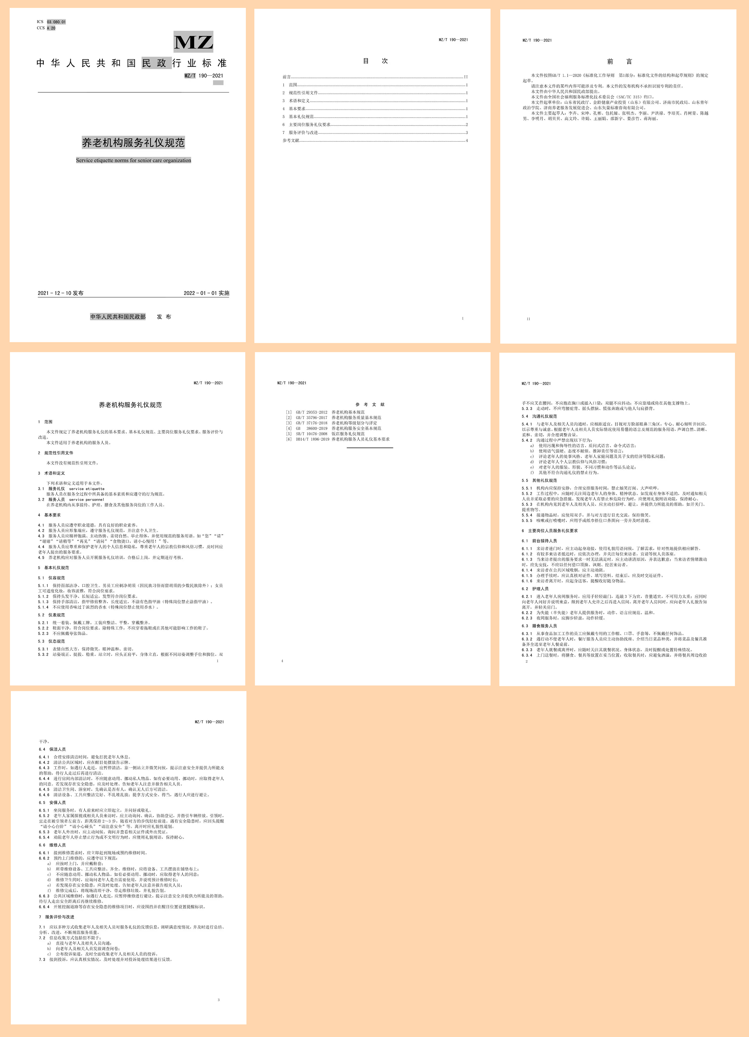 《養老機構服務禮儀規范》規定了養老機構服務禮儀的基本要求、基本禮儀規范、主要崗位服務禮儀要求、服務評價與改進,適用于所有養老機構的服務人員。