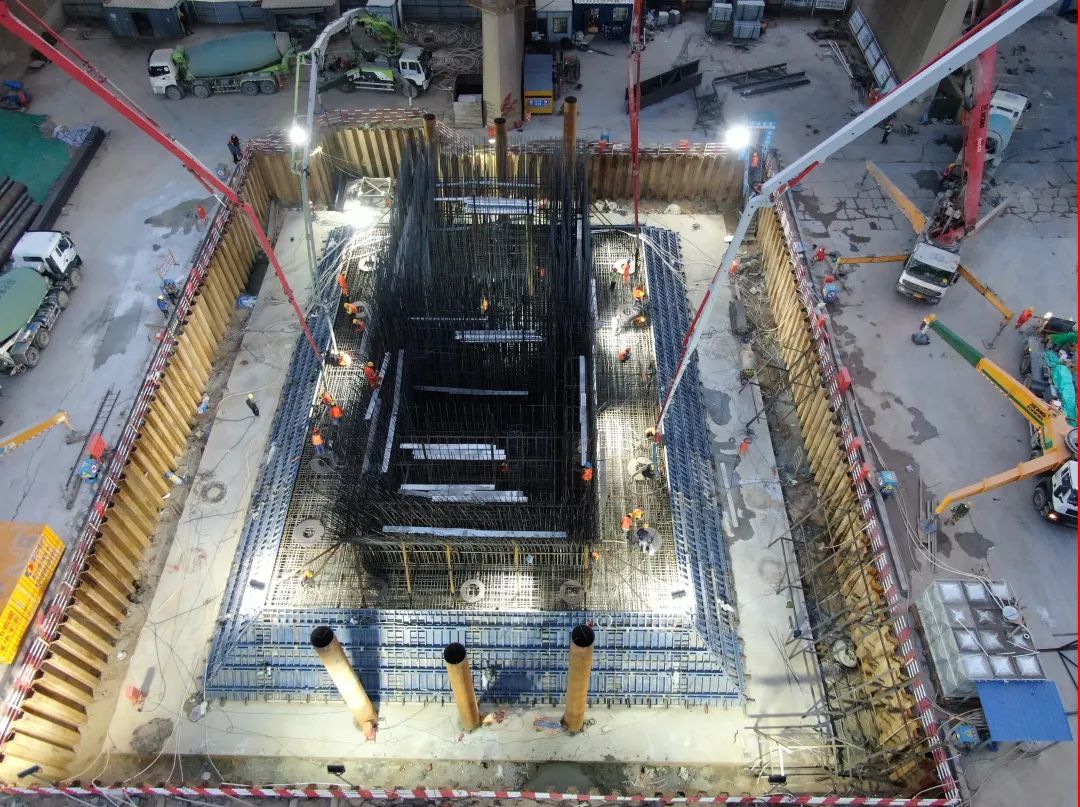 目前,水庫南岸暗埋段第九流水段腳手架搭設完成30%,第十流水段頂板混凝土澆筑完成100%;第十三流水段負三層側墻鋼筋綁扎完成100%,中隔墻施工完成50%,腳手架搭設完成75%;第十四流水段第五道鋼支撐拆除完成90%;第十五流水段底板混凝土澆筑完成75%。同時,管片預制也在同步生產中。
