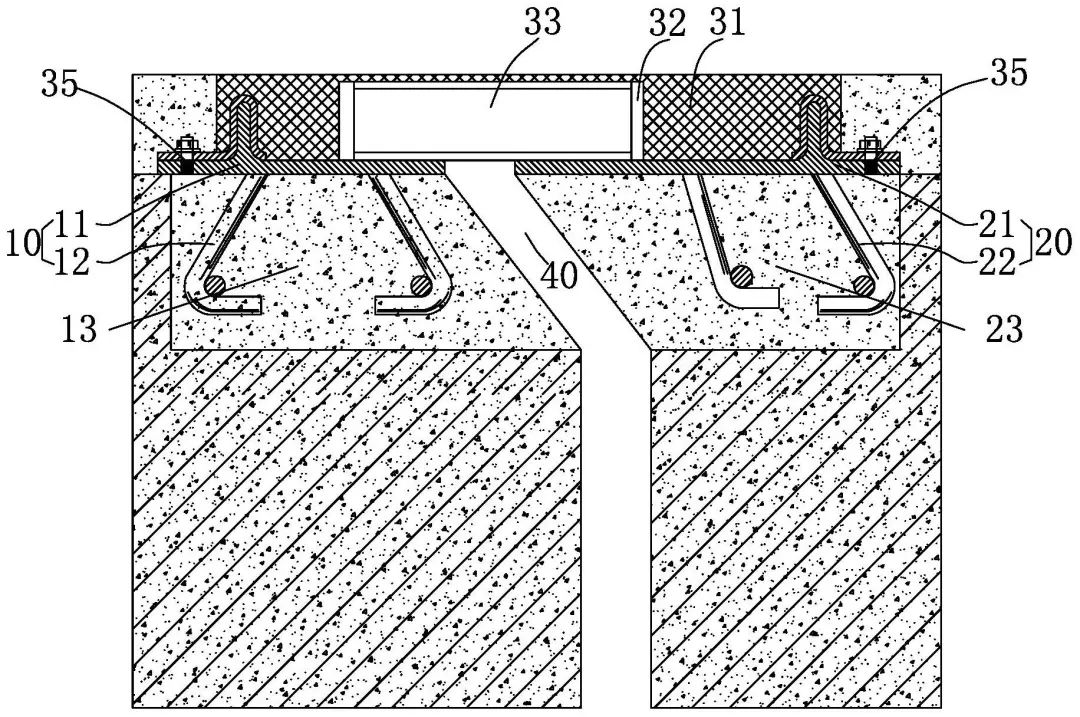 本發明專利用于解決現有的伸縮縫裝置結構復雜、剛性不足、柔性不足等問題。該裝置安裝在兩個橋面之間,包括安裝一部、安裝二部和設置在兩部之間的半剛性連接件,半剛性連接件整體為橡膠材質的彈性體,在該彈性體內部設置有若干沿順橋向設置的空腔,且在該空腔內設置非粘合的抗彎部件,且抗彎部件在該空腔內具有滑動空間;該抗彎部件在伸縮方向和長度方向上具有足夠高的剛度,使得車輛通過該彈性體時具有極高的抗壓剛度。該裝置可以全面覆蓋伸縮縫位置,具有使用壽命長、免清潔、免維護的特點。