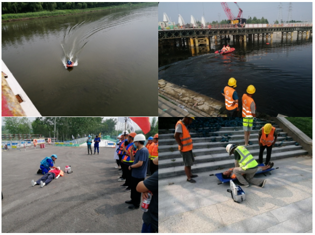 應急響應啟動后,各小組隊員全部到崗到位。第一組進行堤壩加固,確保堤壩安全,防止?jié)⒌?;第二組負責拋投救生圈,進行落水人員的救援;第三組乘坐救援沖鋒舟對落水人員進行救援,將落水人員打撈上岸;落水人員上岸后,由醫(yī)療救護組進行現(xiàn)場急救,并由救護組轉運至醫(yī)院進行下一步治療。