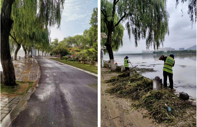 降雨過后,長清湖水面及沿岸道路出現不同程度的雜物和淤泥,為有效控制暴雨后對環境帶來的破壞和污染,景區組織保潔人員用高壓水車以及掃帚等工具著重道路清掃、清理淤泥,并將重點對湖面雜物進行清理清潔,確保在最短時間內恢復景區環境。