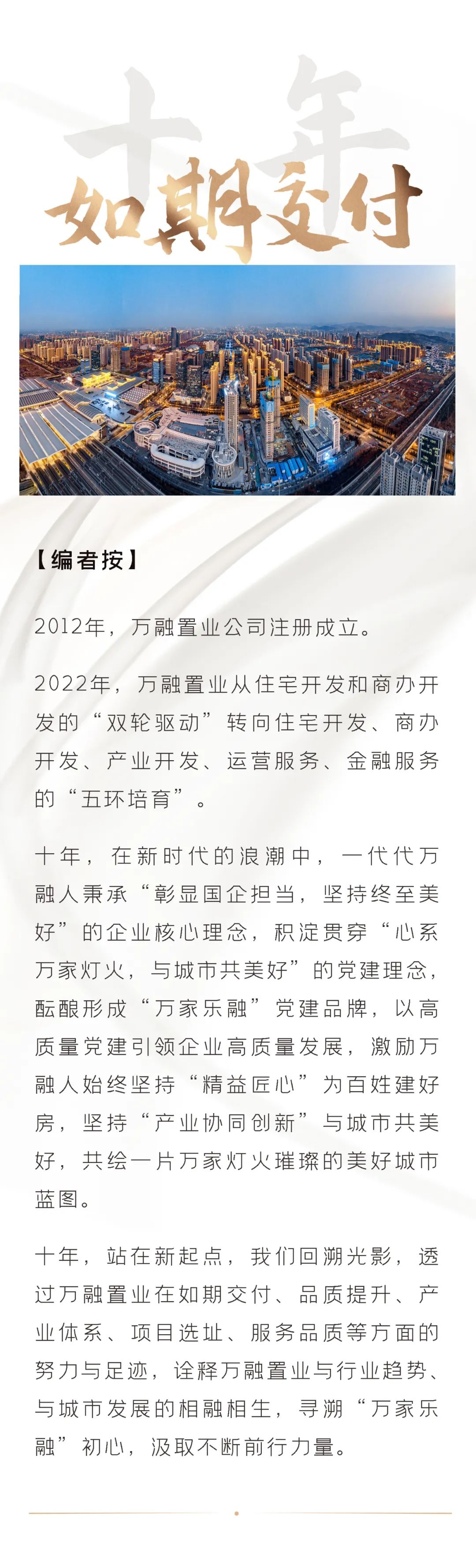 堅持人文關(guān)懷,追求營造高品質(zhì)生活環(huán)境,讓城市品質(zhì)融入萬家燈火,實現(xiàn)如期交付。在卓越如期交付的背后,是萬融置業(yè)品牌背書的實力護航和匠心堅持。