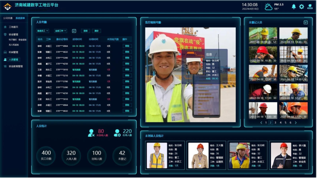 人員管理實現優化,G104京嵐線濟南黃河公路大橋擴建工程項目應用智能化勞務人員管理系統,系統根據視頻采樣,可以實時定位,統計當日出勤人數,能夠針對不系安全帶、不正確佩戴安全防護用品,違章動火作業等進行智能識別,并抓拍報警。系統累計保障工地安全620天,累計錄入工人800余人,攝像頭安裝17個,避免了火災,機械違規載人,安全用品佩戴不規范,防護缺失等隱患發生。