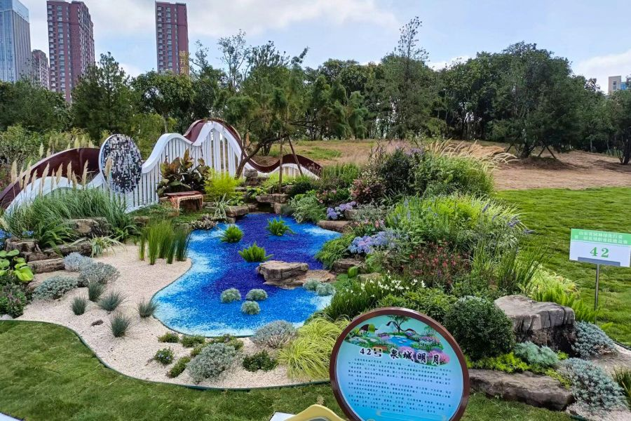 自接到參賽任務后,城建集團公司高度重視,精心組織,選派業(yè)務技能扎實的專業(yè)技術(shù)人員參賽,將此次競賽作為展示集團形象的重要平臺。比賽過程中,參賽隊員積極克服天氣、選材、地形高差、異地施工等困難,在地形塑造、景觀施工、苗木栽植等環(huán)節(jié)中精益求精,以“泉城明月”作為參賽主題,融入節(jié)約環(huán)保、生態(tài)自然的理念,創(chuàng)新使用深藍、淺藍、白色三色琉璃石子漸變仿真水景,與花序、山景共同打造“一城山色半城湖”,再現(xiàn)“泉城月明”意境。