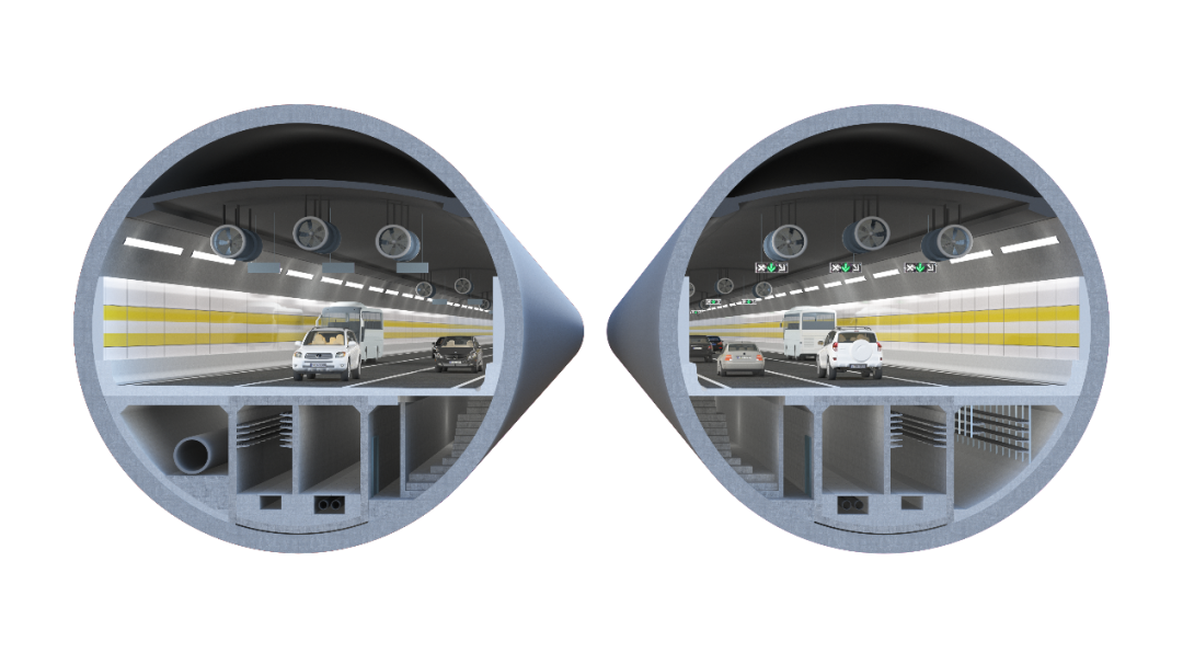 為減少市政管線過黃河成本,充分利用市政隧道下部通道資源搭載穿黃河市政管線,隧道下部預留穿黃河市政管線艙。同時,盾構段采用在車行道路面下設置逃生疏散樓梯與專用逃生救援通道(縱向逃生救援方案),并結合工作井設置車行橫通道、明挖暗埋段設置人行橫通道的縱向結合橫向疏散救援的綜合方案,形成可靠高效的疏散救援設施,確保運行安全。