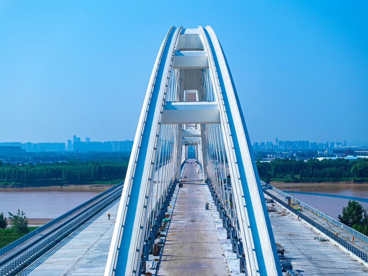 齊魯黃河大橋主橋為“公軌同層,軌道居中”,雙向八車道一級公路標準,主橋鋼箱梁寬60.7米,是世界最大跨度、最寬鋼箱梁、最高應力幅拉索的下承式組合梁網(wǎng)狀系桿拱橋。同時,濟南黃河齊魯大橋跨黃河特大橋將公路、軌道交通、人行道和非機動車道同層共建,實現(xiàn)了橋位資源和土地的集約化利用,減少了對河道和環(huán)境的干擾,降低了工程成本。