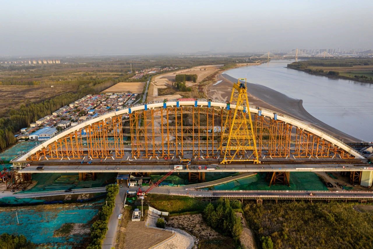 在420米跨拱肋提升中,施工單位中交二公局提出“梁拱分離頂推、先梁后拱、梁上架拱工藝”,創(chuàng)新研發(fā)“無合龍段整體提升合龍工藝”進行主跨拱肋架設,整體提升重量6800T,提升段跨徑300m,提升高度25.5m,為橋梁領域首次研發(fā)并成功應用,被譽為“黃河第一拱、世界第一吊”。
