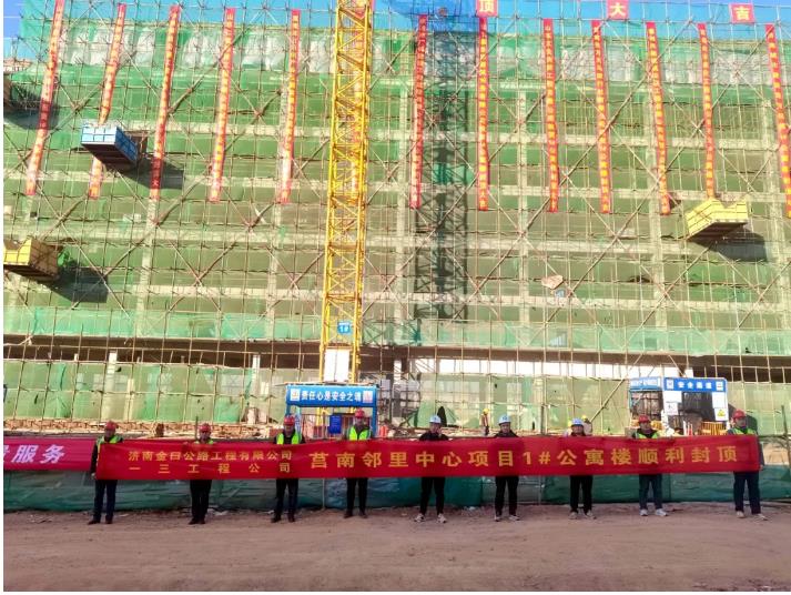 鄰里中心項目是臨沂市觀摩項目,涉及鋼結構、鋼筋混凝土結構、幕墻工程、裝飾裝修、安裝工程、電梯工程、ALC墻板工程等多個專業(yè)性較強的領域,工期緊、任務重,給項目團隊帶來了很大的挑戰(zhàn)。項目部周密策劃組織施工,積極落實質量安全交底,統(tǒng)籌調配人材機配置與進場,鉚足干勁、團結協(xié)作,每天召開例會各個擊破現(xiàn)場問題,不斷提高施工效率、質量。12月15日,項目公寓樓順利封頂,標志著項目建設取得階段性勝利。