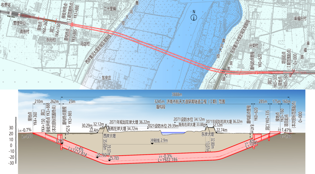 濟(jì)南市航天大道穿黃隧道工程(I期)項(xiàng)目東起高新區(qū)航天大道與X012交叉口,向西下穿黃河后止于西岸起步區(qū)馬店村,全長3888米,作為串聯(lián)黃河兩岸的骨干線,是山東省、濟(jì)南市重點(diǎn)項(xiàng)目,對提升省市形象、改善人居出行、搭建城北片區(qū)骨架路網(wǎng)起到重要的支撐帶動(dòng)作用。