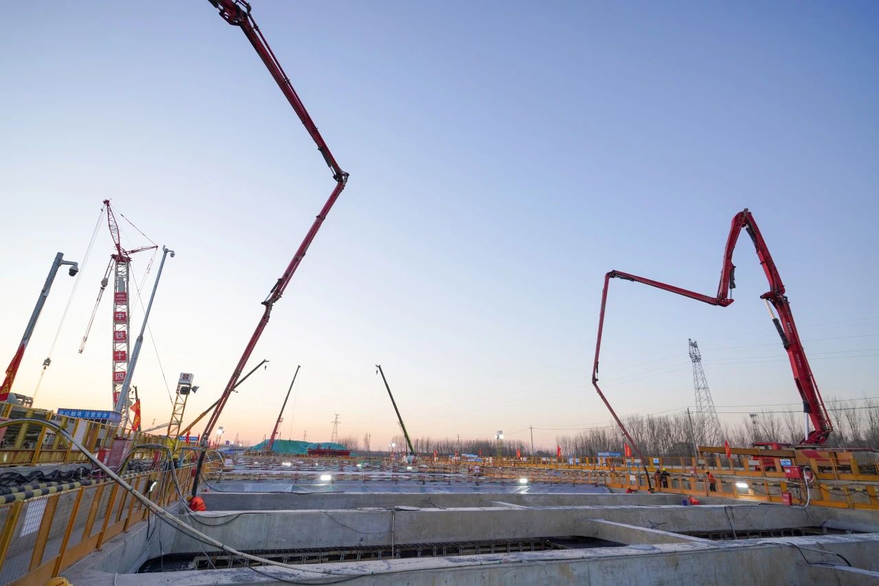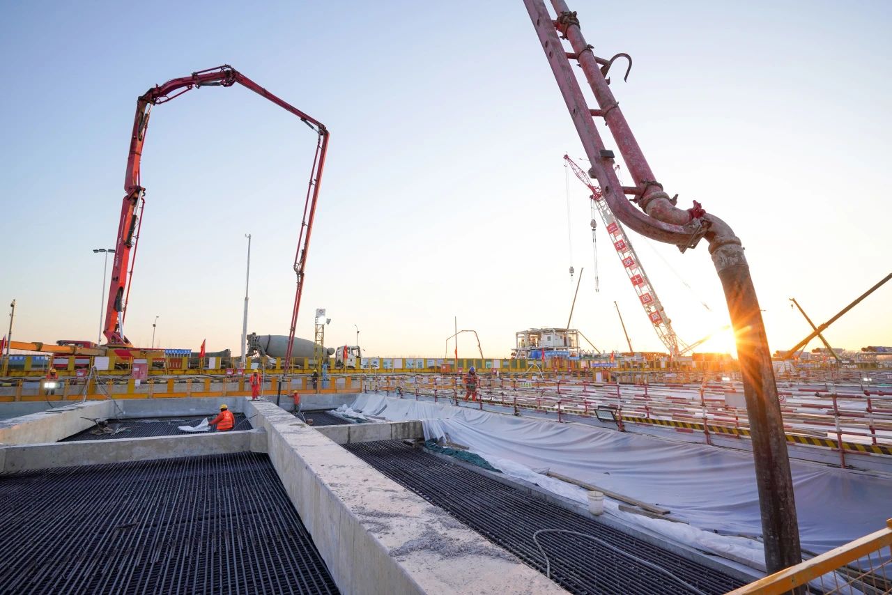 東岸主體結(jié)構(gòu)分為16個(gè)獨(dú)立倉段進(jìn)行施工,鋼筋總量約9500噸,混凝土總方量約4.4萬方。主體結(jié)構(gòu)施工過程中面臨諸多挑戰(zhàn)與困難,施工過程中嚴(yán)格按照施工計(jì)劃,精心組織、科學(xué)管理,對16個(gè)獨(dú)立倉段合理劃分施工區(qū)域,依次展開作業(yè)。各施工班組緊密配合,確保鋼筋綁扎、模板安裝、混凝土澆筑等工序有序進(jìn)行。2024年8月19日主體結(jié)構(gòu)正式開始施工,截至12月29日主體結(jié)構(gòu)完成整體封頂,比原計(jì)劃工期提前28天,為后續(xù)盾構(gòu)始發(fā)奠定了堅(jiān)實(shí)的基礎(chǔ)。