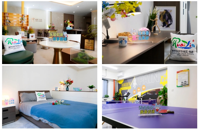 區別于普通出租公寓、酒店賓館,根據青年喜好,植入專屬LOGO 、IP形象等青春元素。房間內部配備床、衣柜、書桌椅、置物架等,并有獨立衛浴、冷暖供應,青年可“拎包入住”。公共區域整體打造自助辦公、學習閱讀、運動健身、共享會客、休閑娛樂、自助廚房6大功能區,滿足青年日常需求。