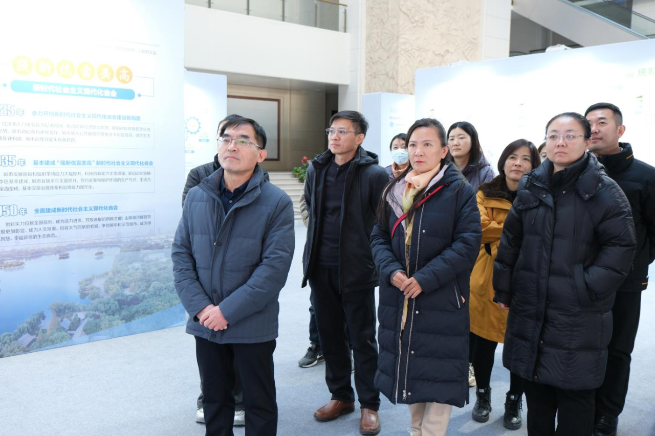 活動(dòng)中,全體人員有序參觀了“錨定目標(biāo) 高點(diǎn)定位”“統(tǒng)籌協(xié)調(diào) 優(yōu)化格局”“開放創(chuàng)新 綠色轉(zhuǎn)型”“人民至上 品質(zhì)生活”“文化名城 泉城魅力”“數(shù)字賦能 保障實(shí)施”六個(gè)篇章。通過(guò)豐富的圖片、圖表和視頻展示,大家對(duì)濟(jì)南市“山東省省會(huì),黃河流域重要的中心城市,國(guó)家歷史文化名城,全國(guó)性綜合交通樞紐城市”的城市性質(zhì)和“北方先進(jìn)制造業(yè)基地、北方商貿(mào)物流中心、區(qū)域性科技創(chuàng)新高地”的功能定位有了全方位、深層次的理解與感悟。