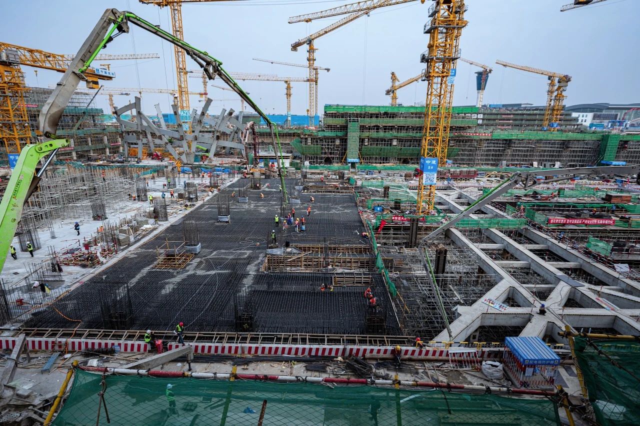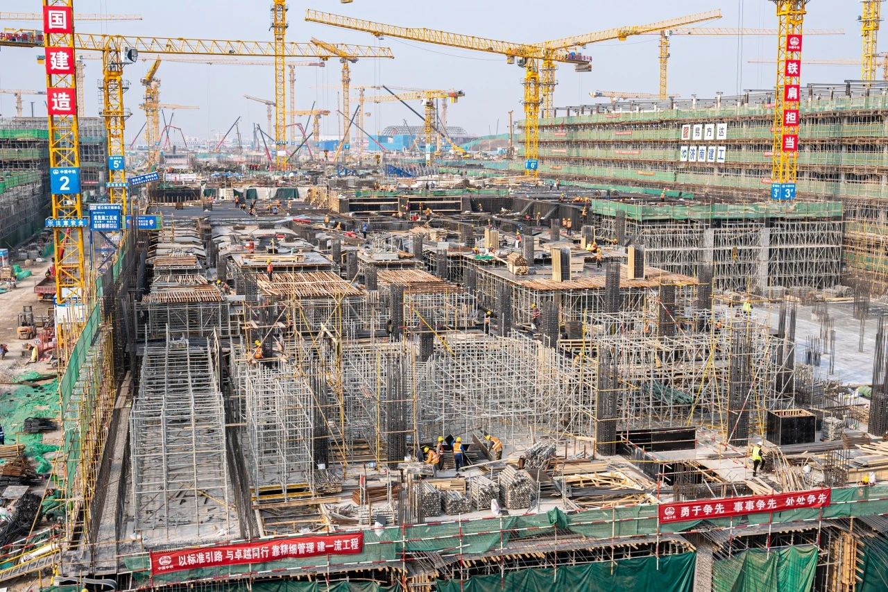 在新建60萬㎡T2航站樓施工現(xiàn)場,項目A指廊正在進行樁基施工,B指廊正在進行地上結(jié)構施工,C指廊已完成主體結(jié)構封頂并正在進行鋼結(jié)構網(wǎng)架吊裝。主樓三、四區(qū)正在進行地下結(jié)構施工,主樓五區(qū)主體結(jié)構已施工至地上二層。
