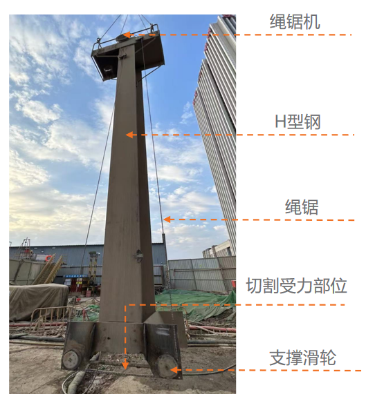 濟(jì)南軌道交通9號線一工區(qū)項目地連墻成槽前需將錨桿切除,因此錨桿切割效率成為制約圍護(hù)結(jié)構(gòu)施工的主要因素。項目部通過查閱資料并結(jié)合施工現(xiàn)場實際,研發(fā)一種適用于地連墻深槽中的錨桿切割設(shè)備。施工過程中,首先使用成槽機(jī)抓槽確定錨桿大致位置,使用測繩加強(qiáng)力磁鐵吸附錨桿精確確定位置;使用履帶吊吊起該設(shè)備,垂直下放到槽內(nèi),使下部鏈條放置在錨桿上,開啟開關(guān)進(jìn)行切割。通過效益對比,使用該設(shè)備施工效率高(切割一根錨桿用時15分鐘)且不會造成塌孔,費用相對可節(jié)約70%,綜合效益顯著。