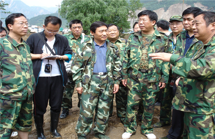 2008年6月,時任濟南市副市長、市抗震救災前線指揮部指揮鄒世平(中)在擂鼓鎮指揮抗震救災工作