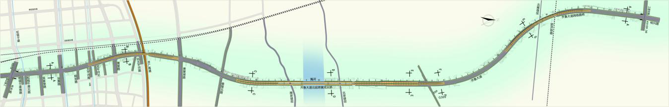 一標段南起現狀濟齊路,向北與虹吸干渠南路、虹吸干渠北路、吳家堡路、治黃路、規劃路相交,采用高架形式跨越太平河南支路、太平河北支路、美里路、太平河北路、濟廣高速后,在美里湖路前落地,高架橋兩側設置一對輔道實現各交通流向的轉換,終點接黃河大橋引橋,平面線位與規劃線位一致,道路全長3671.89米。